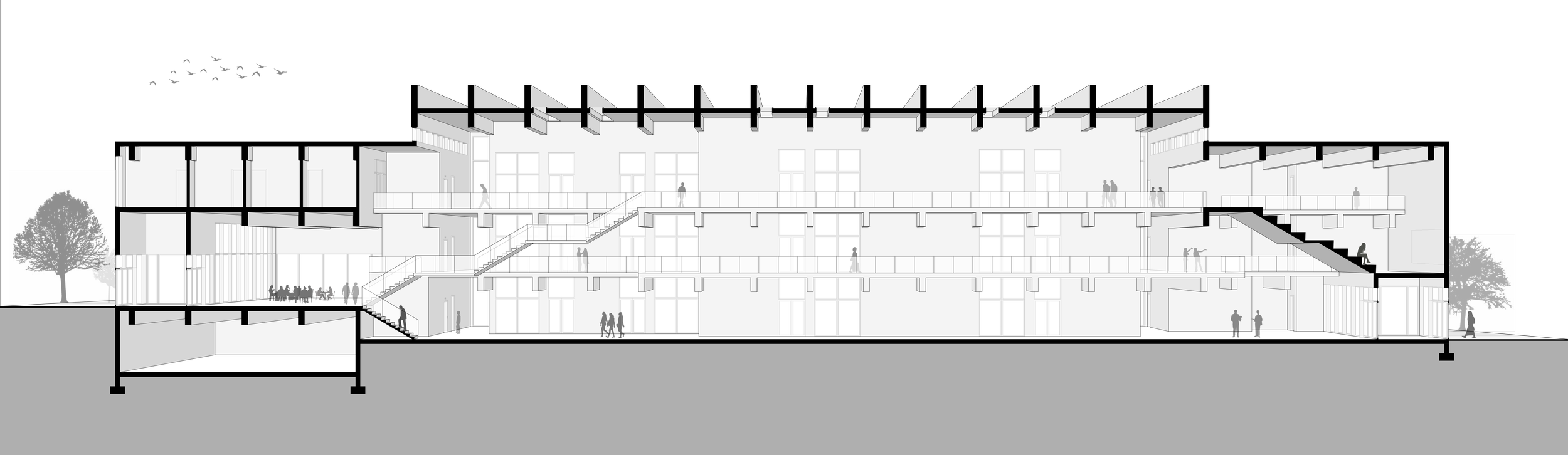 The three-story building has a south and north entrance. The building features a triple-height atrium along the east facade, connecting the north and south nodes. Studios overlook the atrium from the interior balconies, while the lecture hall with stepped seating is located at the northern end.
