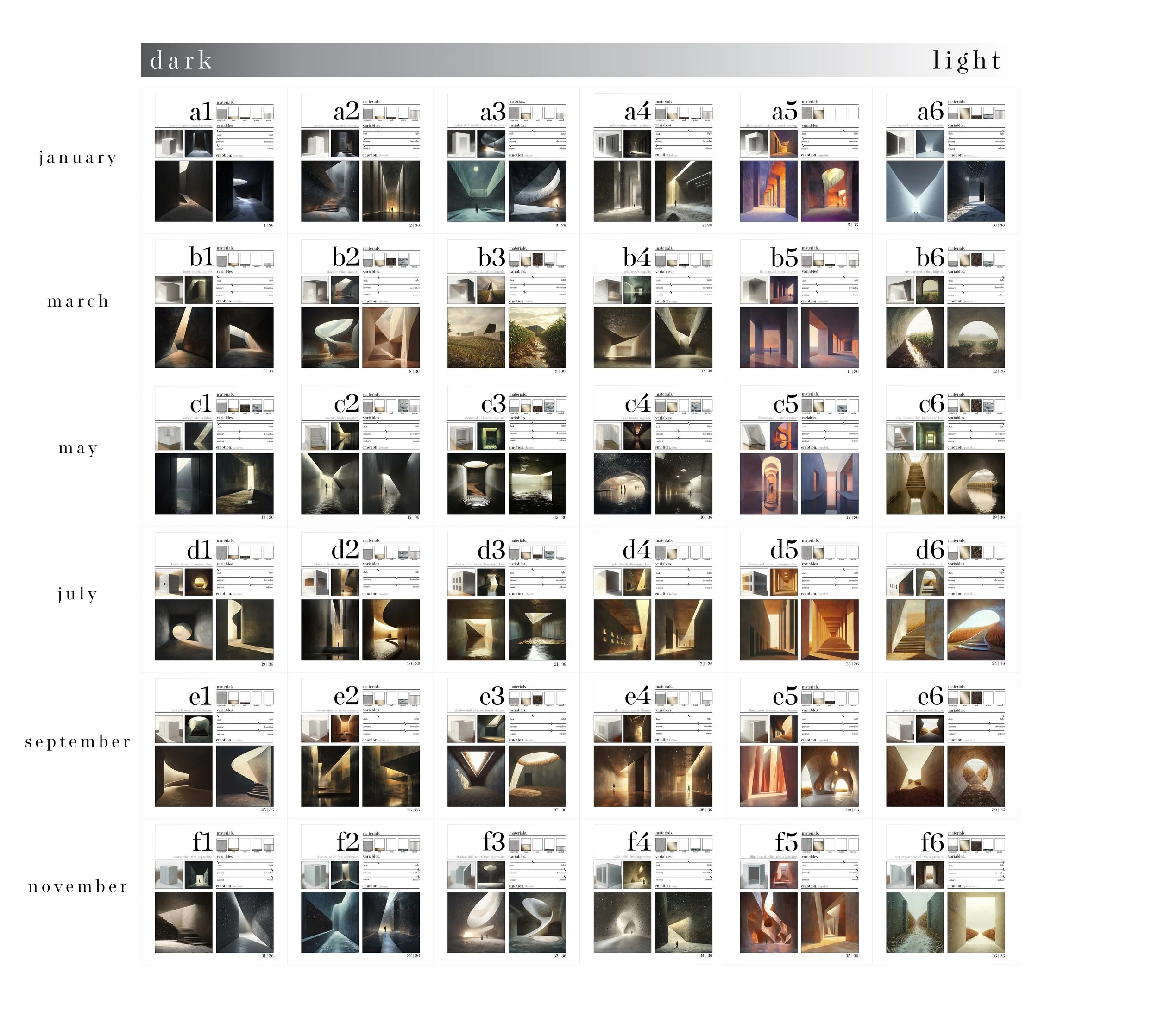 We utilized Midjourney, the AI photo tool, to create renders based on our text prompts. This allowed us to create a design matrix, with an inventory of renders exploring light’s effects on spatial quality. We also explored how the season would affect the spatial quality of our space.